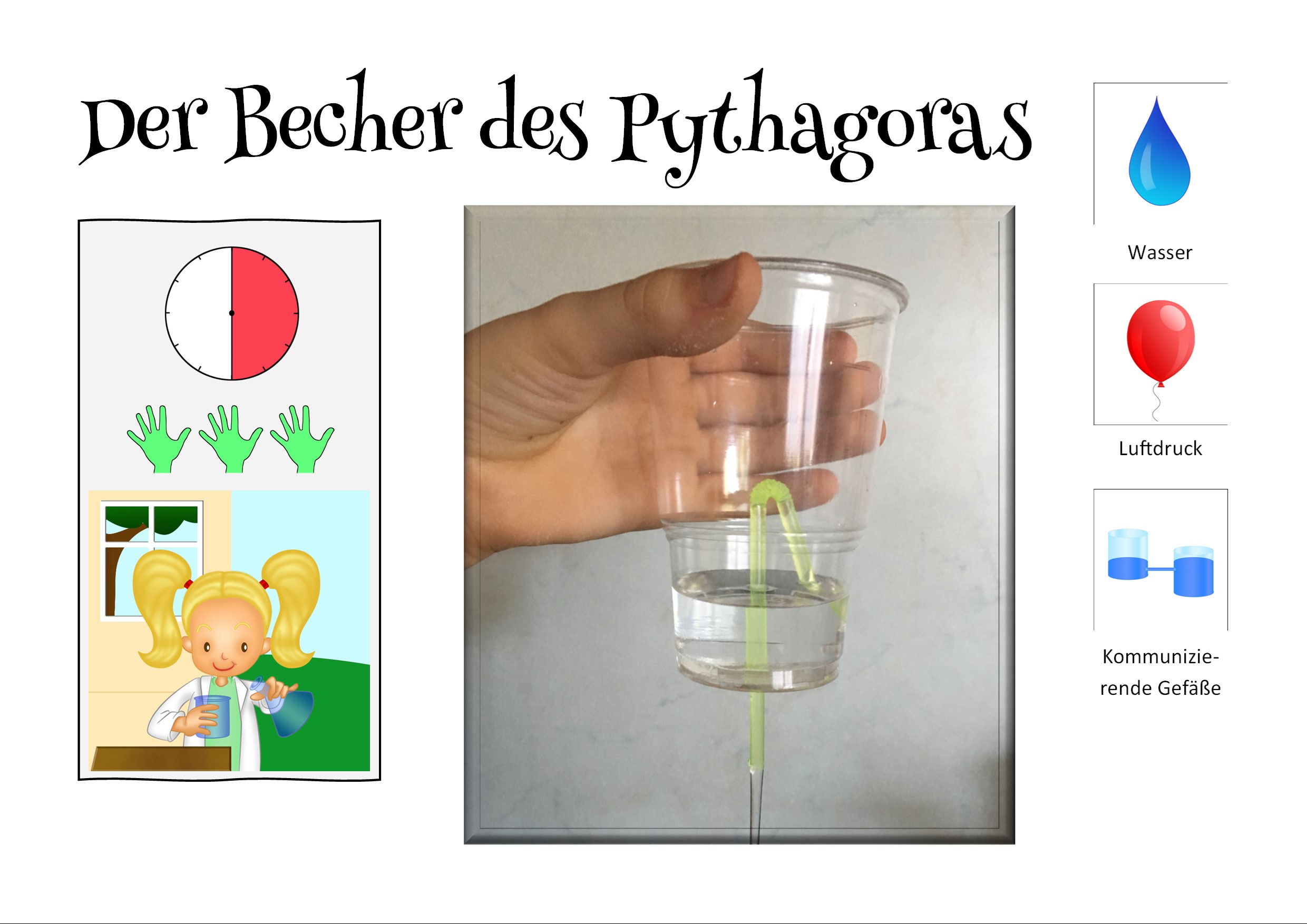 Beim Versuch "Der Becher der Gerechtigkeit" handelt es sich um einen Versuch zu den Themen Schwerkraft, Luftdruck, Kommunizierende Gefäße. Wird der Becher nur halb gefüllt, bleibt das Wasser im Becher, wird er voll gefüllt, läuft es ganz aus.