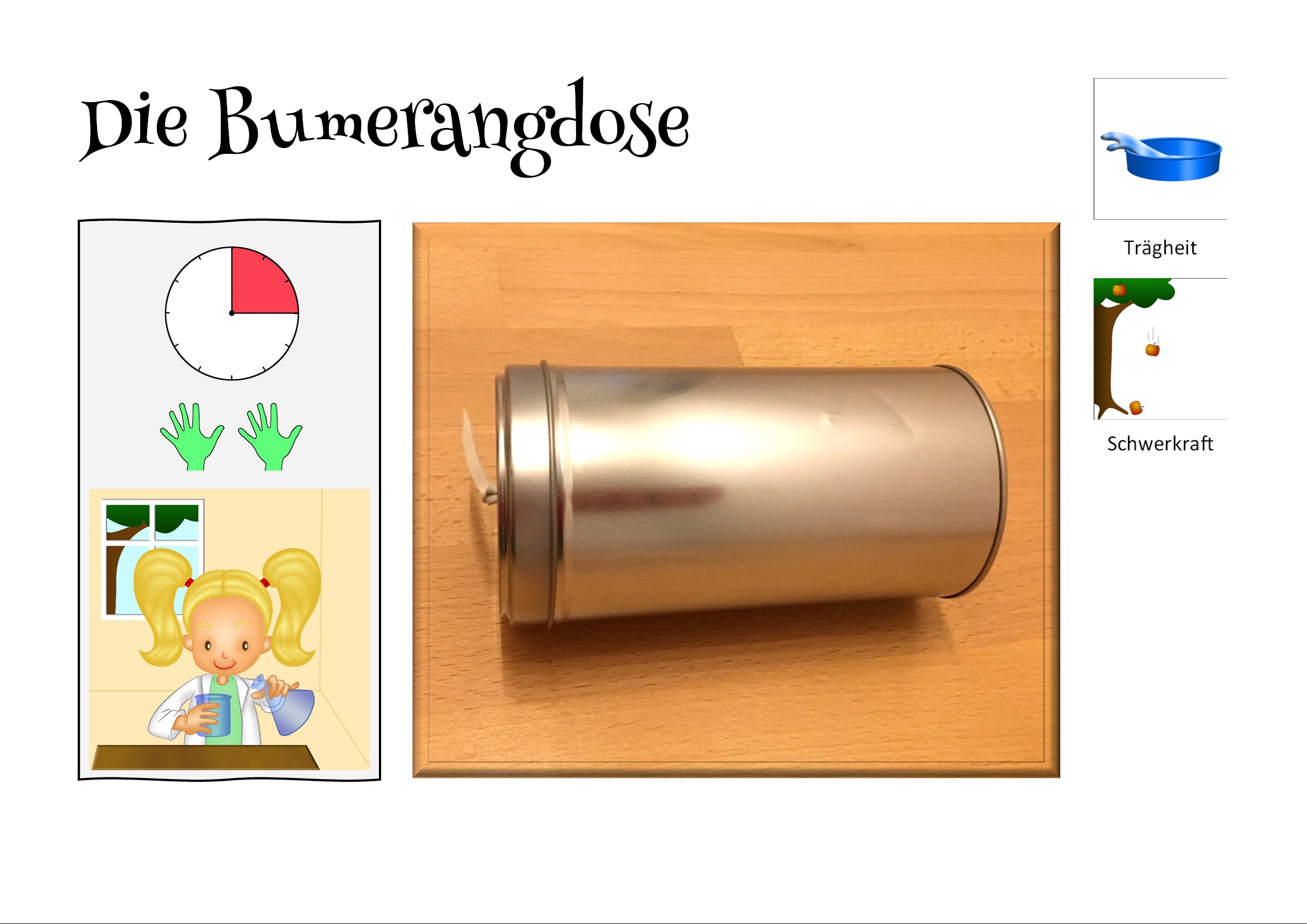 Beim Versuch "Bumerangdose" handelt es sich um einen Versuch zum Thema Trägheit. In einer Dose wird eine Schraubenmutter an einen Gummi geknüpft. Dadurch, dass die Schraubenmutter unten bleiben will, wenn man die Dose langsam rollt, dreht sich der Gummi ein und versetzt die Dose dadurch in die Lage, wieder zurückzurollen.