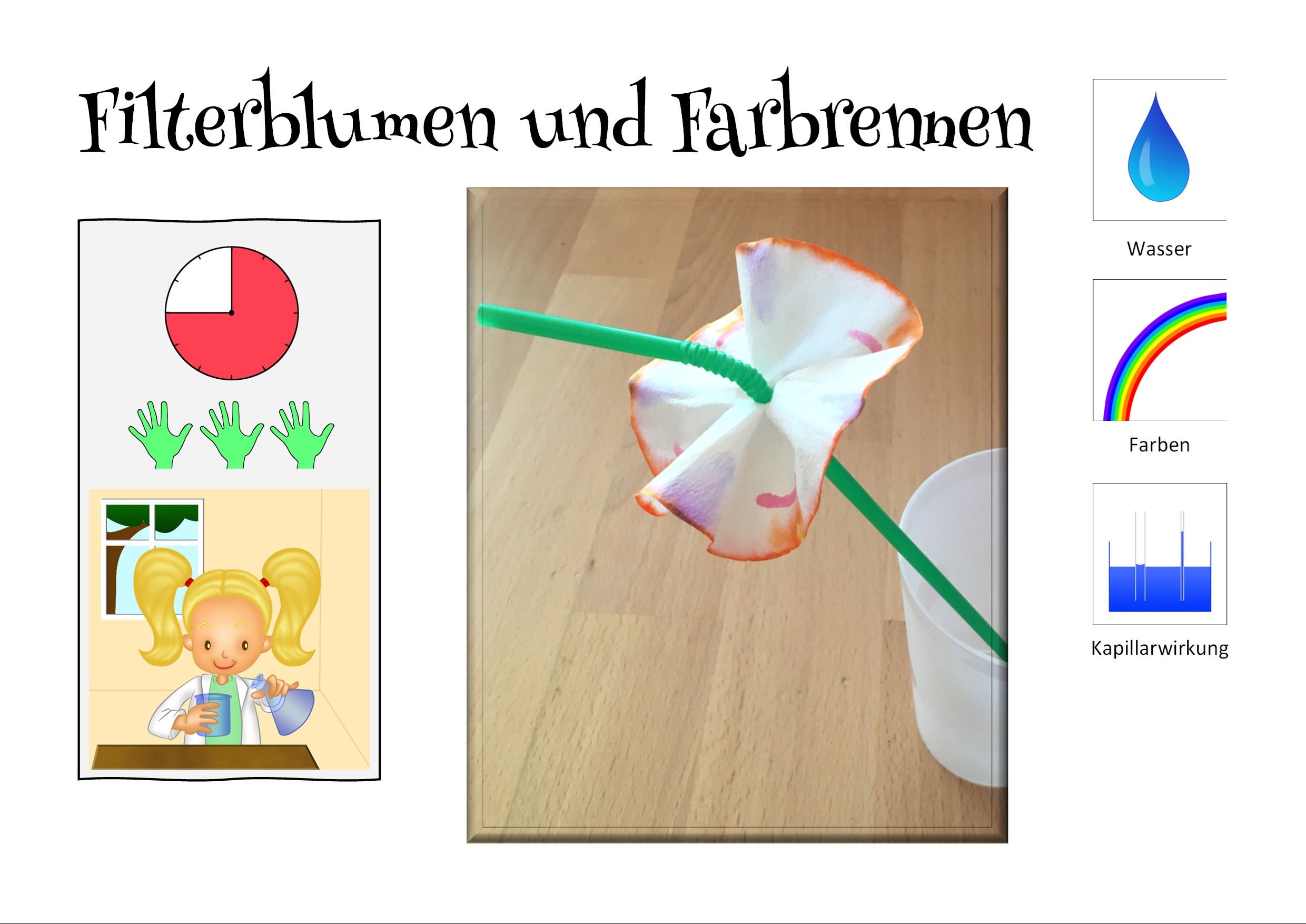 Beim Versuch "Filterblume und Farbrennen" handelt es sich um einen Versuch zur Chromatographie - der Auftrennung von Farben. Auf Filterpapier bzw. Küchenrolle werden Filzstiftpunkte aufgetragen, die mit Hilfe von Wasser in ihre Komponenten aufgespalten werden.