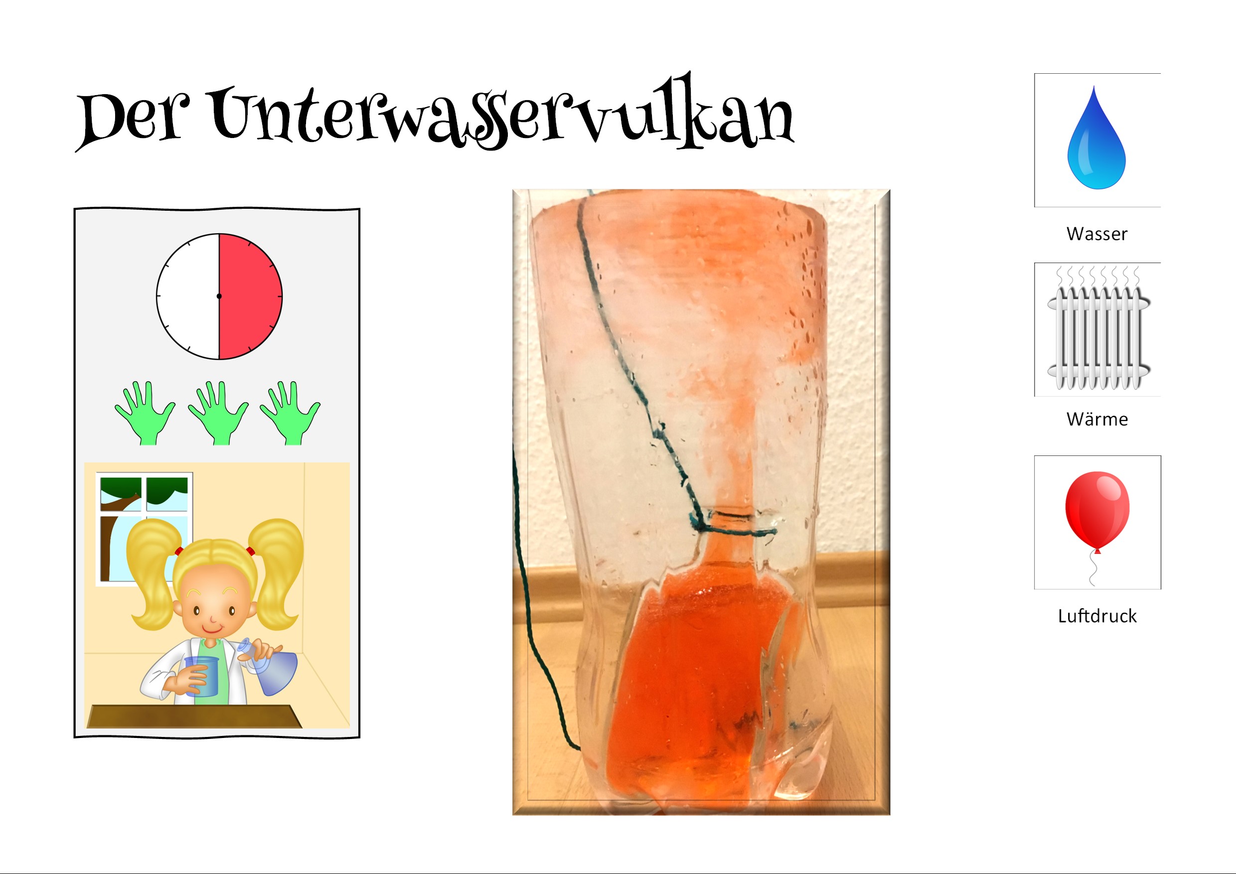 Beim Versuch "Der Unterwasservulkan" handelt es sich um einen Versuch zum Thema Wärmelehre. Ein kleines Fläschchen gefärbtes, heißes Wasser wird in ein Gefäß mit kaltem Wasser abgesenkt. Das gefärbte Wasser steigt aus der Flasche an die Oberfläche des Gefäßes - der "Vulkan" bricht aus.